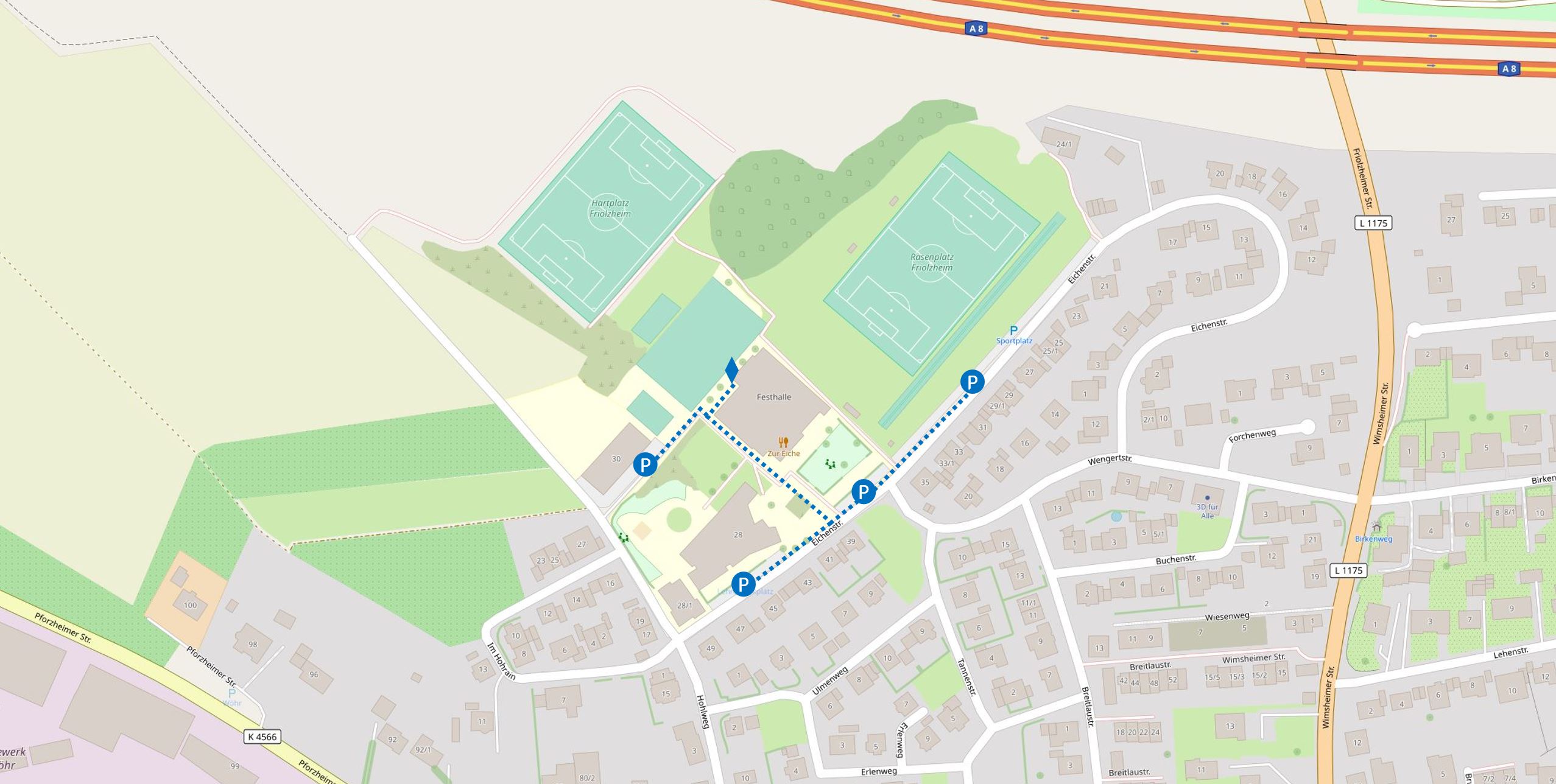 Unser Proberaum ist durch eine Tür am hinteren Ende der Festhalle zu erreichen. Durch den Haupteingang der Festhalle ist der Raum nicht erreichbar. Auf den auf der Karte mit P gekennzeichneten Flächen kann geparkt werden. Die blau gepunktete Linie führt zum Eingang des Proberaums.